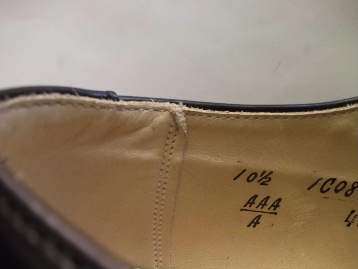 現在庫商品中、US8 3Eの商品は、画像中の最下から3番目左の画像のように、右足インナーかかと部分のライニングが、少し張った感じで仕上げられてしまっています。 現在庫商品中、US9.5 Cの商品は、画像中の最下左右の画像のように、右足アッパー内側履き口部分に、小傷がございます。 それから、左足アッパー外側後方とコバとの境目に傷がございます。 現在庫商品中、US10 Bの商品は、画像中の最下から4番目右の画像のように、左足のインソール下部に、少し擦れた感じの傷がございます。 現在庫商品中、US10.5 Aの商品は、画像中の最下から2番目左右の画像のように、右足インナーの継ぎ目上部が、少しめくれて縫われてしまっています。 それから、左足アッパー内側後方に、2か所小さな凹み型がついてしまっています。 現在庫商品中、US13 Eの商品は、画像中の最下から3番目右の画像のように、左足アッパー内側後方に、少し傷がございます。 以上の点、どうかご了承の程宜しくお願いいたします。 1990年代後半〜2000年代前半のアメリカ製、箱付き、デッドストック(未使用)です。 箱は2種類のタイプがございます。 シューズバッグは、元々付属いたしません。 現在庫商品中、両足のアッパーに試着によるシワが少しだけ入ってしまっている商品がございます。 どうかご了承の程、宜しくお願いいたします。 ALDEN(オールデン)のモックトウ・ブルーチャーのオールドモデルです。 アッパーは、ブラックのポリッシュドカーフです。 アウトソールは、ウォーターロック・ソール(雨の吸い上げを防止する為及び、ソールを柔らかくしなやかに曲がるようにする為に、オイルをたっぷり染み込ませたレザーを使用しています)です。 ラストは、TRUTRED LAST(トゥルートレッド・ラスト)です。 |