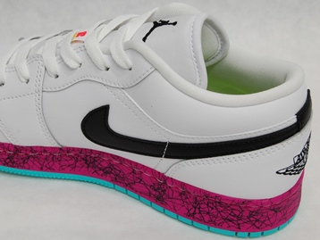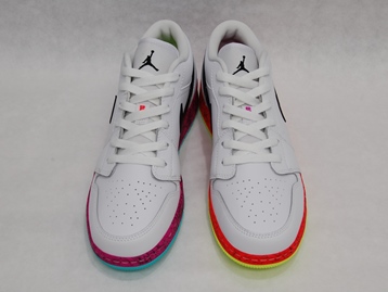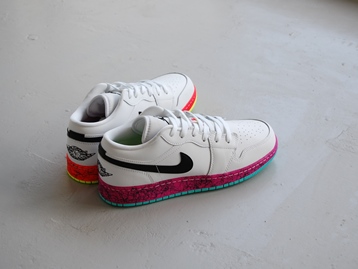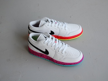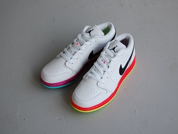 箱付き、新品(未使用)です。 NIKE (ナイキ) の air jordan 1 low grades gs (エアジョーダン 1 ロー グレイズ GS) です。 エアジョーダン1のソールを左右色違いで仕上げた、US限定日本未発売モデル。 ホワイトベースのアッパーです。 アッパーはベーシックなホワイトブラックですが、ソールの演出が効いていて綺麗です。 |