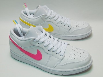 箱付き、新品(未使用)です。 NIKE (ナイキ) の AIR JORDAN 1 LOW (エアジョーダン 1 ロー) です。 マルチスウォッシュのエアジョーダン1で、US限定の日本未発売。 オールホワイトのアッパーベースに、両サイドのスウォッシュを全て違うカラーで仕上げた華やかなAJ1です。 シューレースの先端もマルチカラーになっています。 |