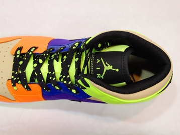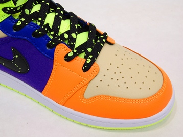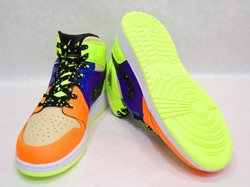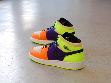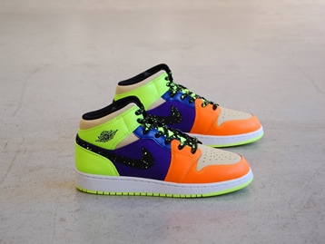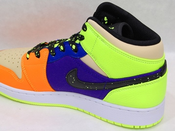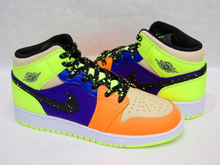 箱付き、新品(未使用)です。 NIKE (ナイキ) の AIR JORDAN 1 MID SE GS (エアジョーダン 1 ミッド スペシャルエディション グレードスクール) です。 カラフルカラーで仕上げられた、エアジョーダンワンミッドの限定スぺシャルエディション。 テクスタイルと、シンセティックレザーとのコンビアッパーです。 スウォッシュとシューレースがスプラッターになってます。 |