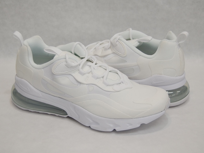 箱付き、新品(未使用)です。 NIKE (ナイキ) の air max 270 react gs (エアマックス 270 リアクト グレードスクール) です。 エアマックス270にリアクトフォームを融合させたモデルで、海外限定カラーの日本未発売。 ホワイトのシンセティックレザーと、テクスタイルとのコンビアッパーです。 適度なボリューム感にバランスのいいフォルムで、履き心地の進化を堪能できます。 |