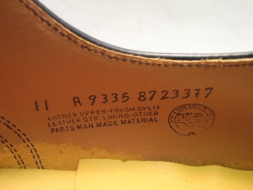 1977年のアメリカ製、箱付き、デッドストック(未使用)です。 現在庫商品全て、両足インソールのソックシート(踵下部分のライニング敷物)の周りにわずかなボンドのはみ出し及び、端の方の反りが少しだけございます。 どうかご了承の程、宜しくお願いいたします。 RED WING(レッドウィング)の 9335 のオールドモデルです。 モック・トウのオックスフォードシューズです。 スチールトウではありません。 タグは"MADE IN USA"入りのプリント羽タグです。 ブラックのスムースレザーをアッパーに使用しています。 アウトソールは、ラバーのクッション・ソールです。 |