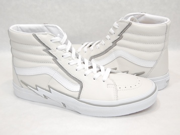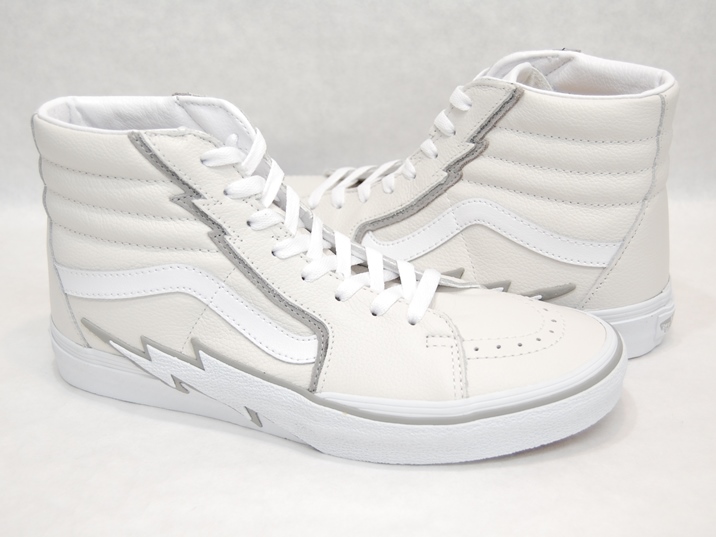 箱付き、新品(未使用)です。 VANS (バンズ) の SK8 Hi (スケート ハイ) です。 US企画のスケート ハイで、インパクトのある稲妻デザイン。 ホワイトとグレーのレザーアッパーです。 オールレザー仕様です。 |