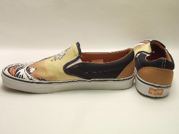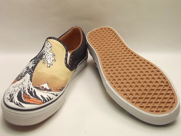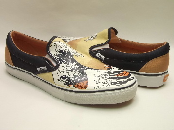 | 2006年製、箱付き、新品のデッドストック(未使用)です。 現在庫商品全て、箱はかなりボロボロで、透明のガムテープで補修してあります。 アメリカの VANS(バンズ) から登場した、US企画の SLIP-ON LX(スリッポン LX) です。 アメリカ国内で、数十店舗のみに限定で展開しているスーパーリミテッドシリーズ VAULT(ボールト) のワンモデルです。 どのモデルも基本的にモデル名に"LX"(高級の意味)と入っており、凝った素材や高級な風合い感のあるものばかりを展開しています。 このスリッポンは、葛飾北斎の富嶽三十六景の中でも有名な作品"神奈川沖波裏"が前面にプリントされたレアモデルです。 和風なカラーリングのキャンバス素材をサイド及び後部に使用しています。 バンズでは非常に珍しい和柄で、かなりインパクト大です。 |